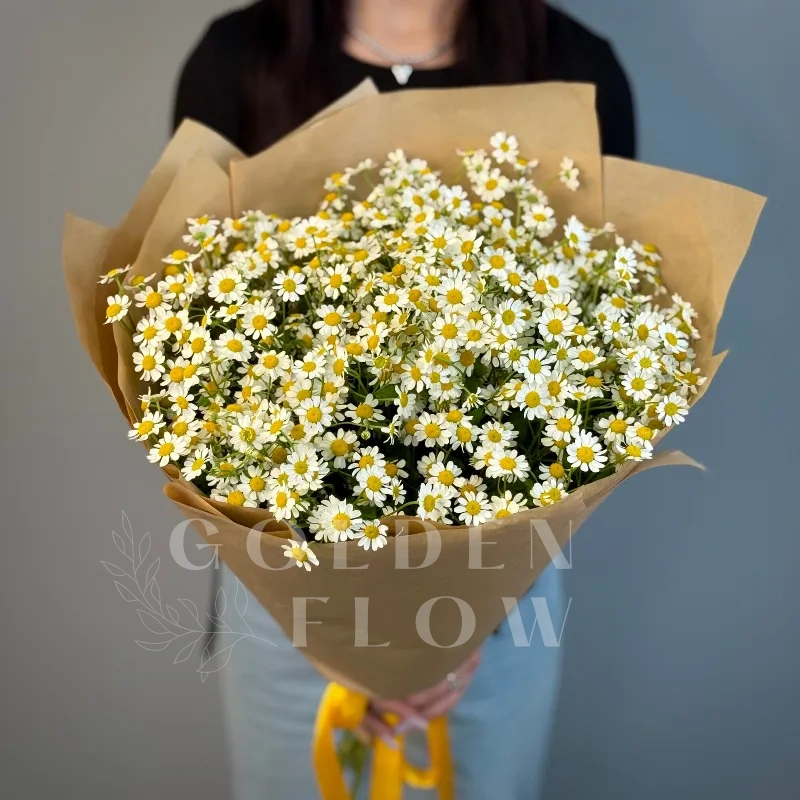 Букет из матрикарии (ромашки) — это композиция, которая передаёт атмосферу простоты, нежности и естественности. Эти цветы, напоминающие пушистые ромашки, обладают лёгким ароматом мёда и яблок, что делает их особенно привлекательными для флористических работ.