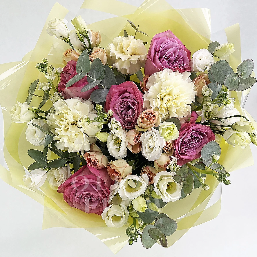 ГлавнаяКаталогБукетыБукет с розами и эустомой «Идеал»