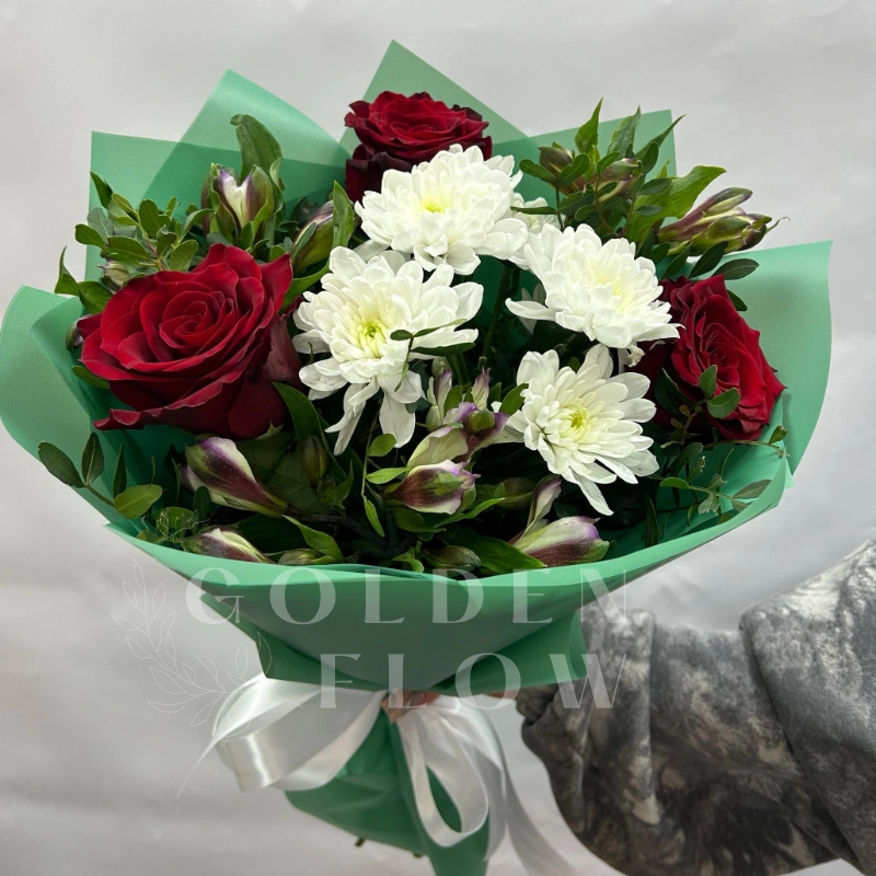 Букет с красными розами и хризантемой «Яркие эмоции»