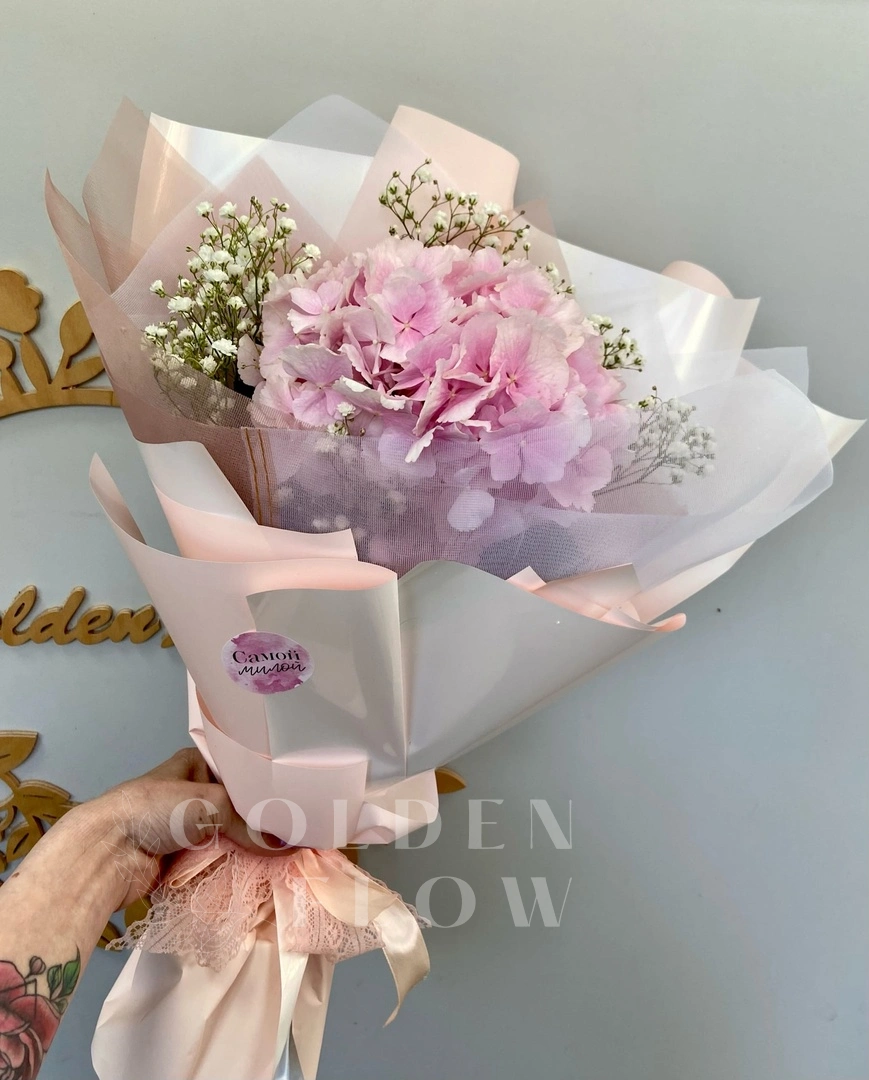 Нежный букет из гортензии и гипсофилы в современном оформлении
