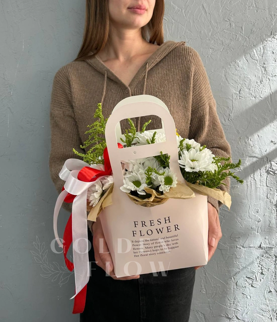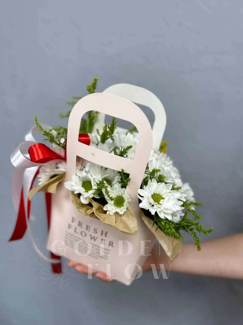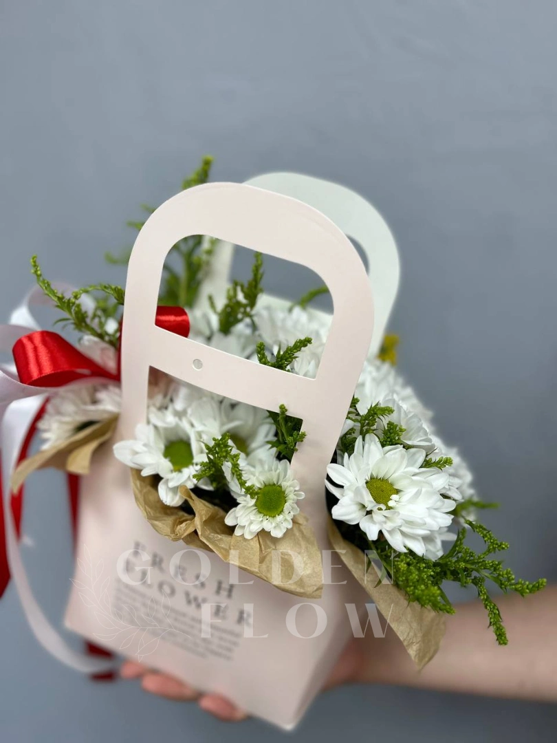 Летняя композиция как поле из ромашек: ромашковая хризантема, сочная зелень. Игривая и стойкая композиция в сумочке.