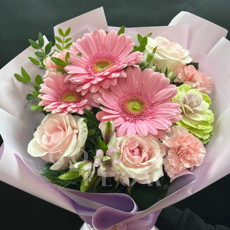 Сборный букет «Нежное очарование» — это изысканное сочетание нежных цветов, идеально подходящее для любого повода. Альстромерия придает букету воздушность и романтичность. Герберы создают настроение радости и бодрости. Элегантные розы подчеркивают искренние чувства и нежность. Гвоздики добавляют богатство текстуры и стойкости композиции. Каждый цветок тщательно подобран и гармонично сочетается с остальными элементами.Такой подарок станет замечательным выражением внимания и добрых чувств. «Нежное очарование» подчеркнет вашу особенность и отлично подойдет для поздравления или украшения интерьера.