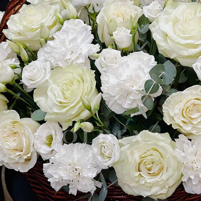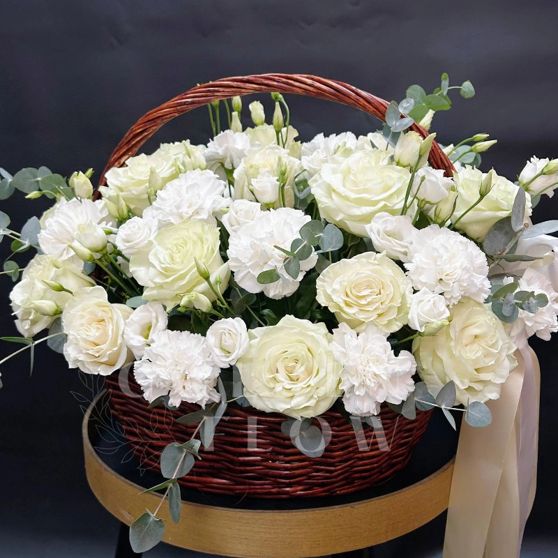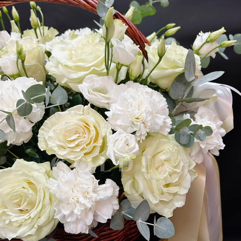 Композиция из 21 белой розы, гвоздик и эвкалипта, собранная в плетеной корзине и украшенная нежной лентой, излучает элегантность и свежесть. Этот прекрасный цветочный ансамбль идеально подходит для создания романтической атмосферы. Композиция станет идеальным подарком для близких и дорогих людей.