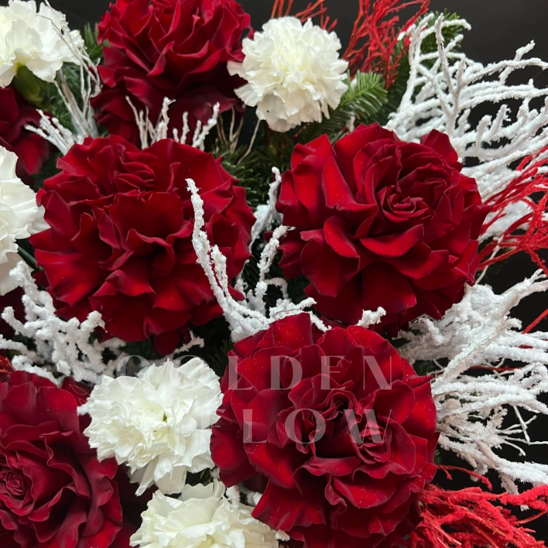 Букет представляет собой элегантную композицию из красных роз и белых гвоздик, дополненную декоративными веточками. Красные розы символизируют страсть и любовь, а белые гвоздики добавляют элегантность и чистоту. Букет прекрасно подойдёт для выражения глубоких чувств или в качестве праздничного подарка на любое торжество.