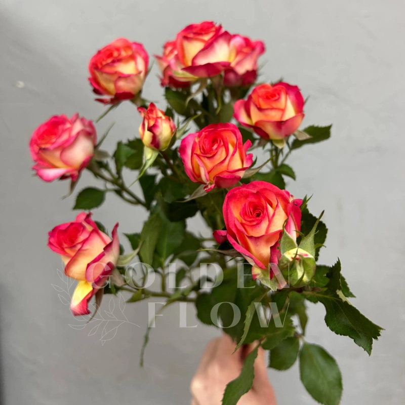 Эта кустовая роза — настоящее воплощение летнего танца природы! Её соцветия словно сотканы из солнечных лучей и закатного пламени: нежные лепестки переливаются оттенками ярко-розового, плавно переходящими в солнечно-жёлтый у основания. Такой цветовой контраст создаёт ощущение лёгкости и радости, превращая розу в настоящий акцент любого букета или садовой композиции.