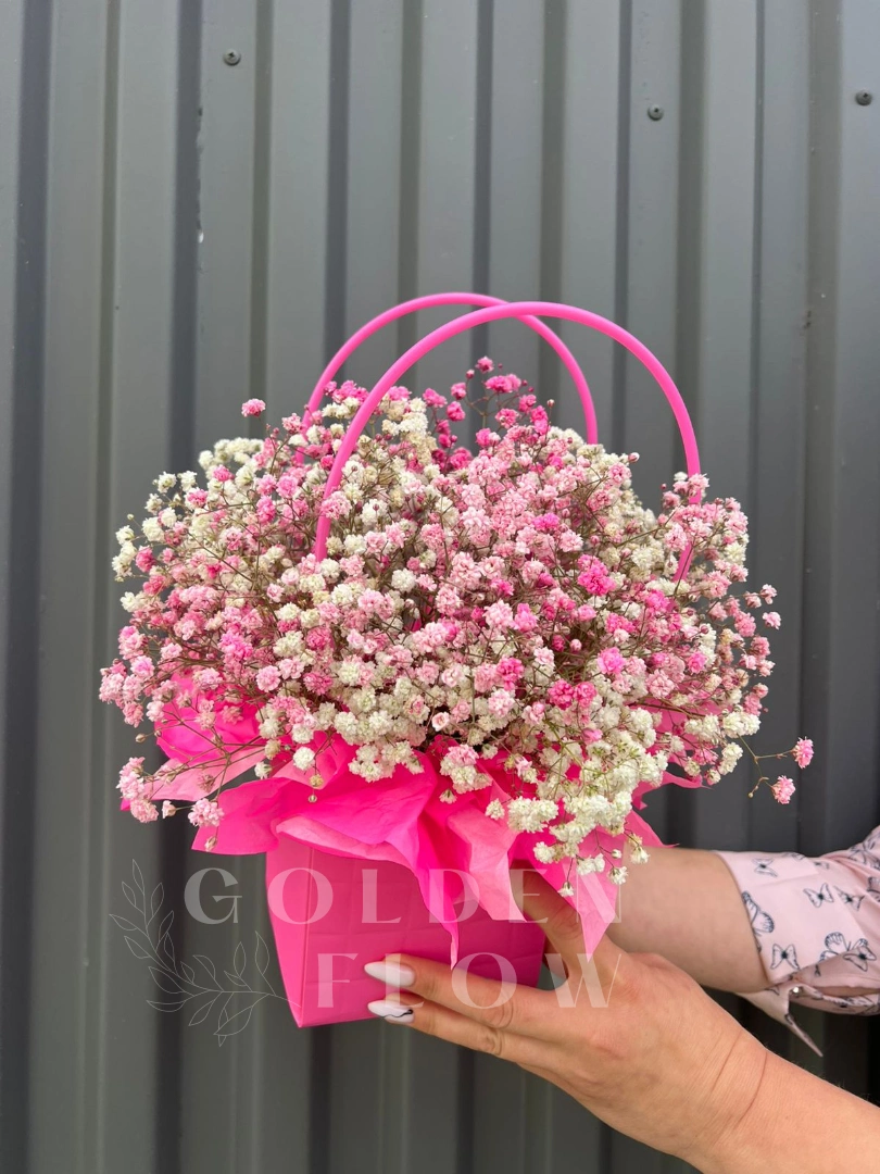 ГлавнаяКаталогКомпозицииГипсофила бело-розовая в сумочке
