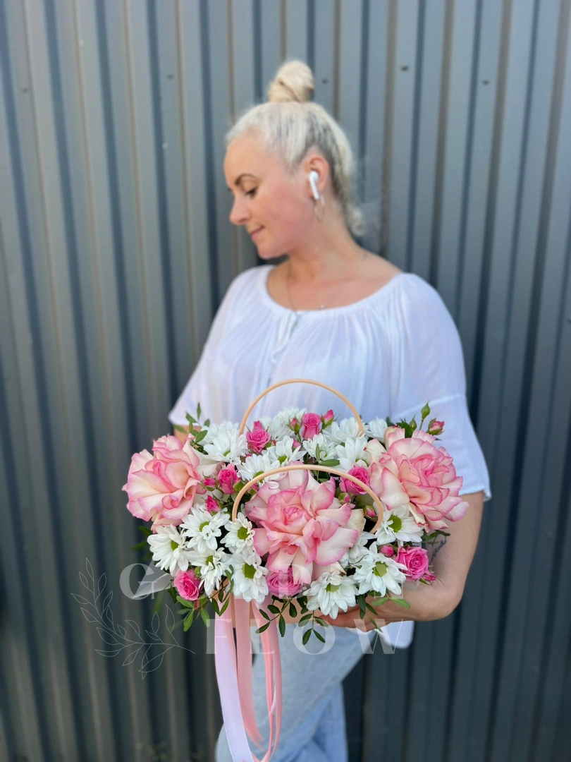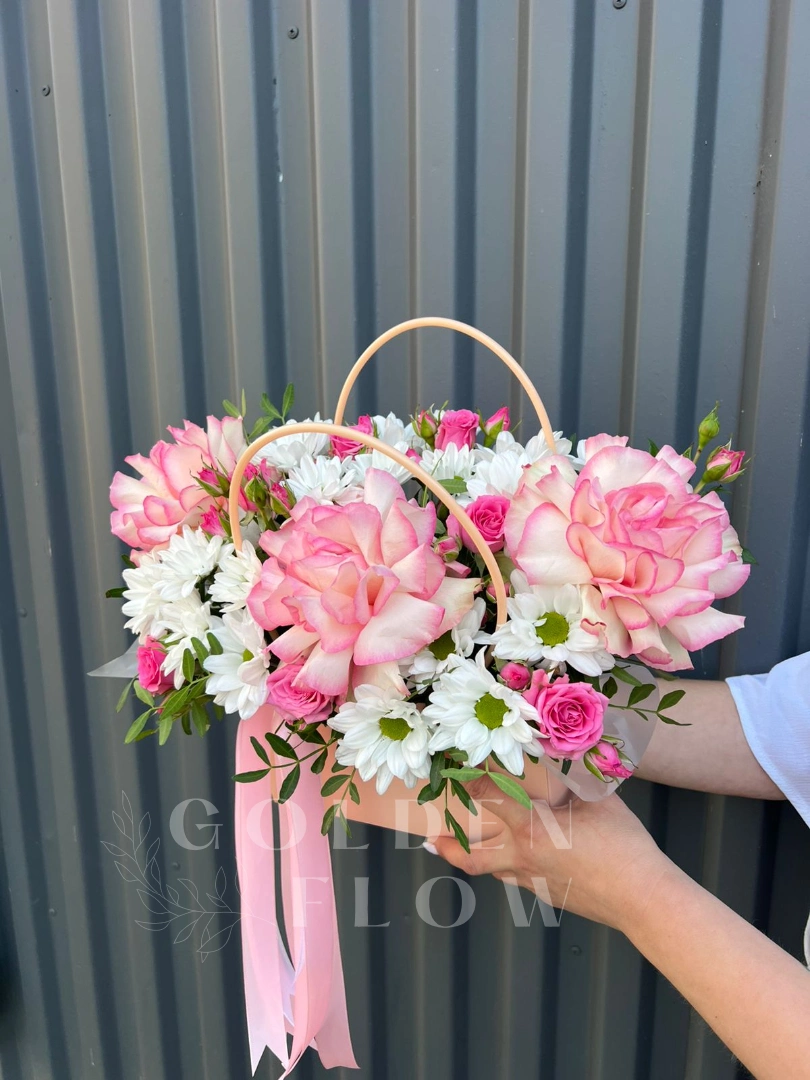 ГлавнаяКаталогКомпозицииФранцузская роза с хризантемой в сумочке